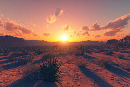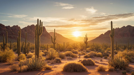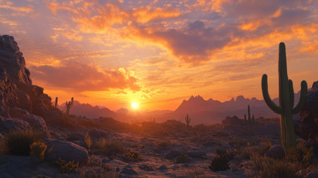 Vibrant desert landscape at sunset with cacti
