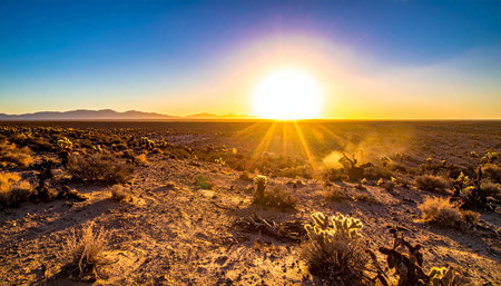 desert sunrise, with the sun peeking over the horizon and casting warm light on the landscape, created with generative ai