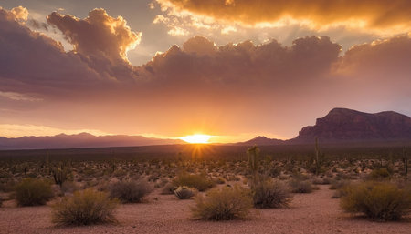 A stunning sunset casts golden hues across a desert landscape featuring dramatic clouds and mountain silhouettes. Nature's beauty unfolds in this tranquil scene.