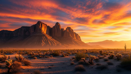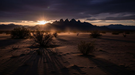 majestic sunset over desert landscape, with silhouette of towering mountain range in the background, created with generative ai