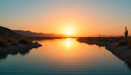Desert sunset reflecting on lake water with cacti foreground