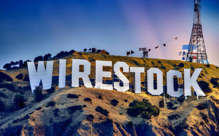 An AI generated illustration of iconic Hollywood Sign on a hill with Wirestock inscription