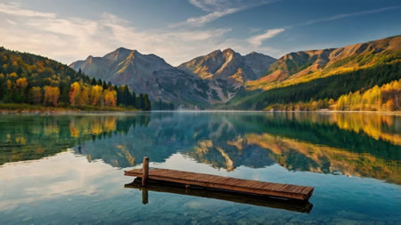 The tranquil lake mirrors surrounding mountains and lush forests, creating a perfect moment of serenity during the early morning hours. Nature invites calmness and reflection.