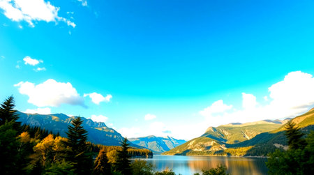 Serene lake surrounded by majestic mountains, reflecting sunlight on crystal-clear waters and peaks.