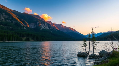 a breathtaking sunset over a serene lake reflecting the majestic mountains and sky above.