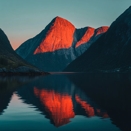 Mountains reflected in fjord at sunset. Norway, Scandinavia