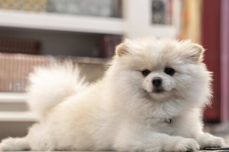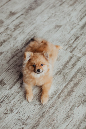 Pomeranian spitz resting on floor. Portrait of a beautiful dog sitting on floor. Small dog of Pomeranian Spitz funny playing in the bed room. Pet care and animal concept