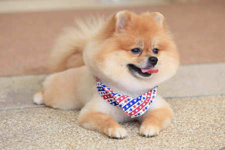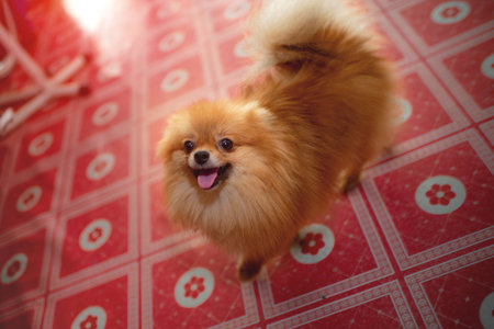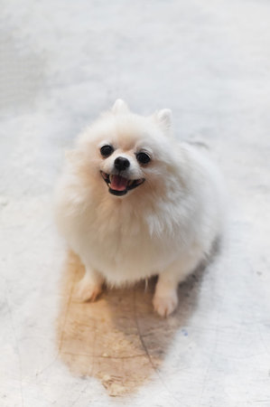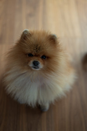 Portrait of pomeranian dog or dwarf spitz sitting on the floor