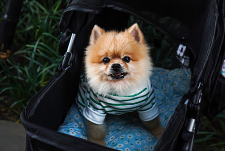 Pomeranian Dog Wearing Clothes in Dog Stroller