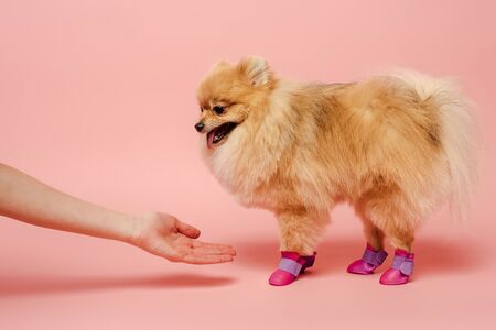cropped view of female hand and cute pomeranian spitz standing in dog shoes on pink