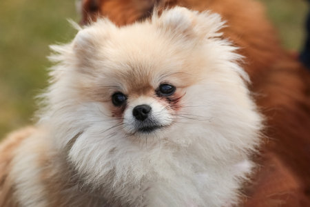 Cream Orange Pomeranian Miniature Spitz, a companion dog, stands close-up and looks up