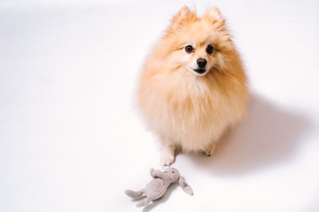 Cute young pomeranian dog. Beautiful puppy spitz sitting isolated on white background, studio shot. Ridiculous miniature dog.