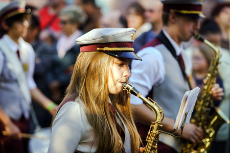 Mengen, Bolu / Turkey - August 03 2019: Marching band performing in Mengen International Culinary and Tourism Festival (34. Mengen Uluslararasi Ascilik ve Turizm Festivali in Turkish)