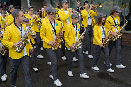 Kiev, Ukraine - May 19, 2018: Brass band marching at a street music festival