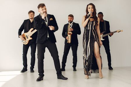 Multiracial music band on a white background. A group of international musicians rehearsing a concert performance. Vocalist, ram, guitarist