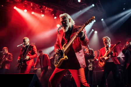 A band performing on stage, with musicians playing instruments and a singer in the spotlight, AI generated