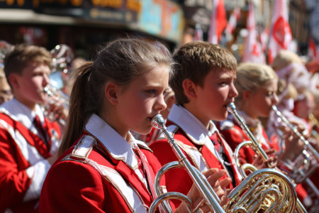 Kids in matching band uniforms are playing trumpets during a town parade celebrating local pride