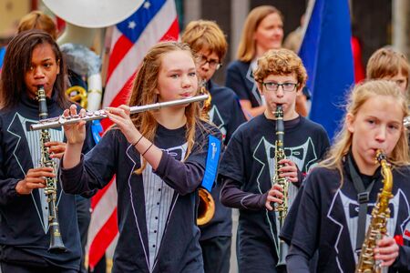 Portland, Oregon, USA - November 11, 2016: Mt. Tabor Middle School Marching Band in the annual Ross Hollywood Chapel Veterans Day Parade, in northeast Portland.