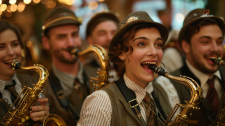 Three men play saxophones outdoors, wearing vintage-style attire and smiling joyously. A celebration of music, camaraderie, and tradition captured beautifully in a charming, timeless setting.