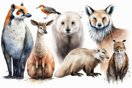 Animal set. A painting in watercolor on white. Generative AI