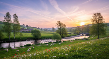 A serene countryside landscape at sunrise a winding river, lush green hills dotted with grazing sheep, and a meadow filled with colorful wildflowers.