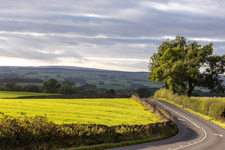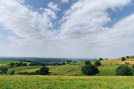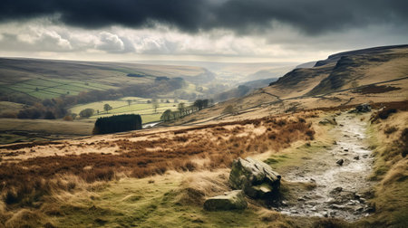yorkshire's breathtaking panorama unfolds with rolling hills, lush green pastures, and rustic stone walls, showcasing the picturesque countryside's serene beauty, perfect for hikers and nature lovers, with the majestic north york moors and yorkshire dales national park serving as a stunning backdrop. ai generated