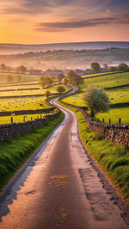 Green showing winding country road through rolling green hills and quaint stone cottages under a warm golden sunset sky in a picturesque rural landscape keywords:...