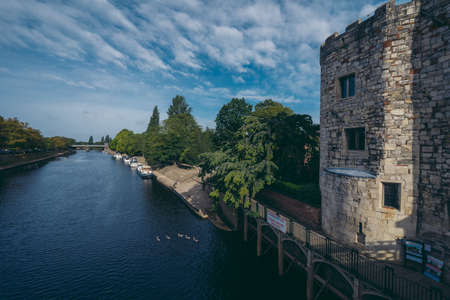 York, North Yorkshire | UK - 2020.09.11: River Ouse embankment wit boats moored on the side