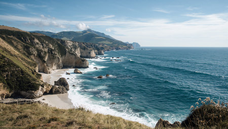 A serene view of the Pacific coastline with cliffs and crashing waves. No people, copy space.