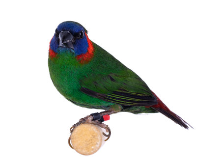 Red eared parrotfinch aka Erythrura colori bird, isolated on white background.