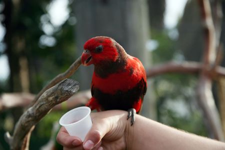 Beautiful red and brown lorikeet perched on an arm
