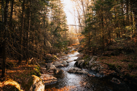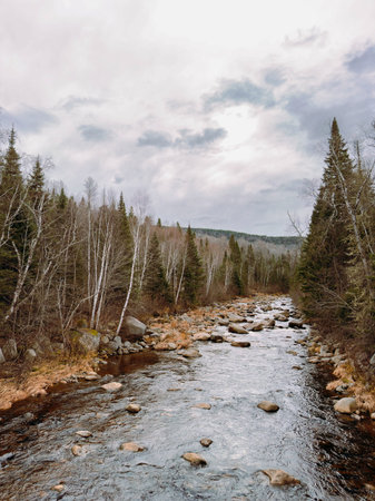 Mountain river in autumn. Quebec, Canada. River in the boreal forest.