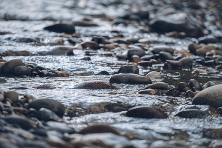 A close-up of rounded stones in a river, with water gently lapping against them, creating a peaceful and natural scene perfect for outdoor photography