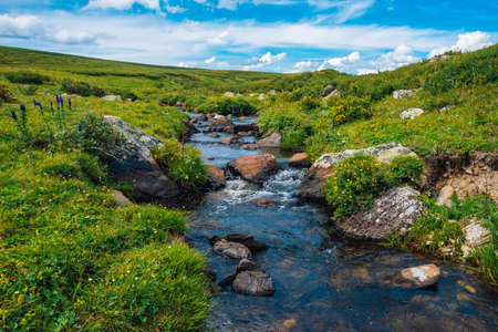 Scenic nature background with lush grasses and flowers near small mountain stream with clear water. Beautiful wild flora of highlands in small river. Idyllic nature scenery. Rich alpine vegetation.