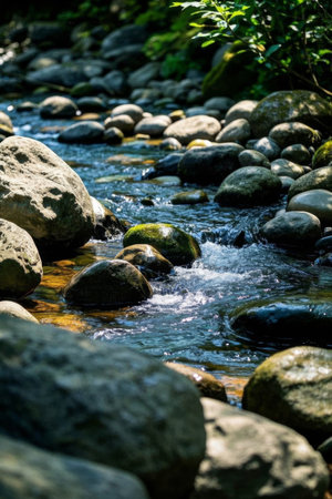 Clear, flowing stream rushing over rocks in dappled sunlight, nature's beauty