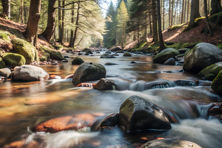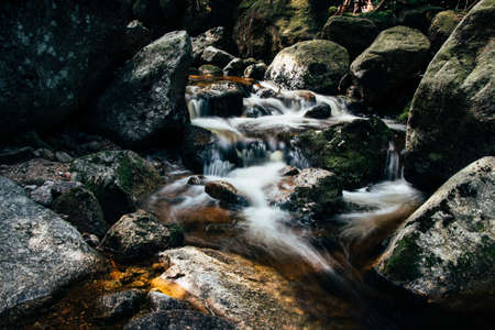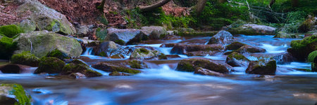 Panoramic view of a picturesque river hidden in the Jizera Mountains in the north of the Czech Republic, where the bridge of the natural wealth is hidden. Moss-lined stones.
