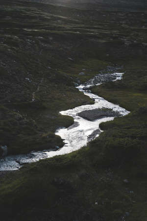 Spring water stream in green valley in sunny day. Rich highland flora. Amazing mountainous vegetation near mountain creek. Wonderful paradise scenic landscape. Paradisiacal sunny picturesque scenery.