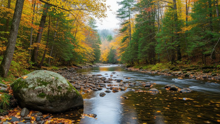 Autumn landscape with a river and rocks in the forest. Colorful foliage in the forest.