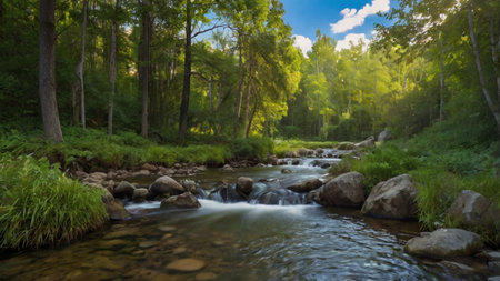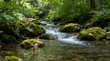 Serene summer landscape stream flowing through mossy stones and lush green forest trees