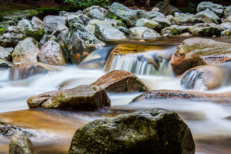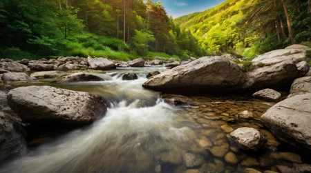 Long exposure photo of a mountain river with blurred, white water washing big boulders
