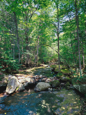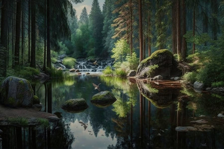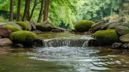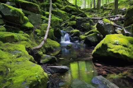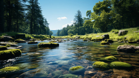Serene summer landscape stream flowing through mossy stones and lush green forest trees