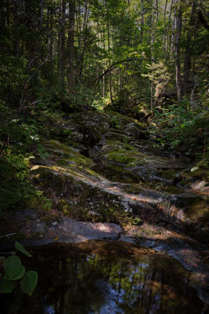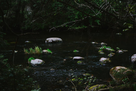 dark stones covered with green moss lie in a forest stream. Forests of Karelia