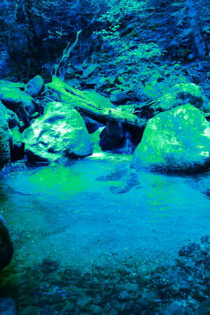 The stream is hidden in the thickets of plants, landscape. Stones in the water. Green leaves on body of water. tinted image.
