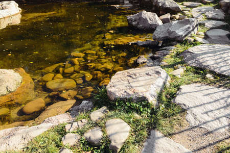 Scenic nature background of turquoise clear water stream among rocks with mosses, lichens and wild flora. Atmospheric mountain landscape with transparent mountain creek. Beautiful mountain stream.