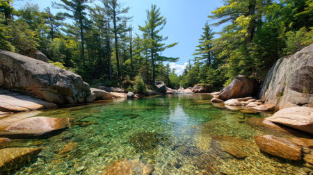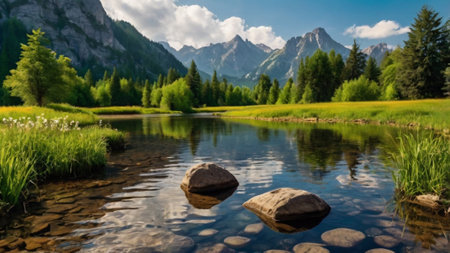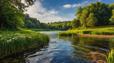 Crystal clear river flowing through a vibrant green landscape