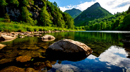 A view of a lake in the mountains in the summer season.