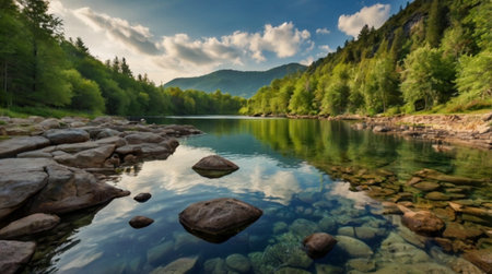 Peaceful view of summer river flowing through the green rocks