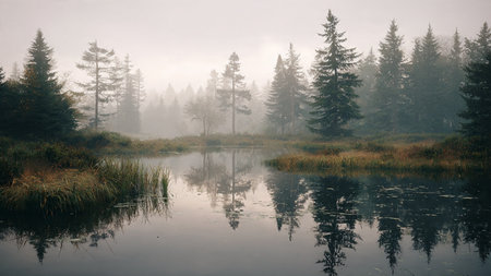 Beautiful green forest and river in the morning. Natural background.