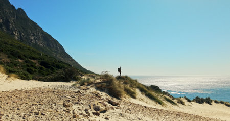Mockup, hiking and man with space for travel, adventure and fitness for journey with backpack. Male person, trekking and explore dune for exercise, eco tourism and nature for holiday or vacation