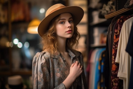 fashion, style and portrait of girl shopping for clothes at a vintage store or boutique, created with generative ai